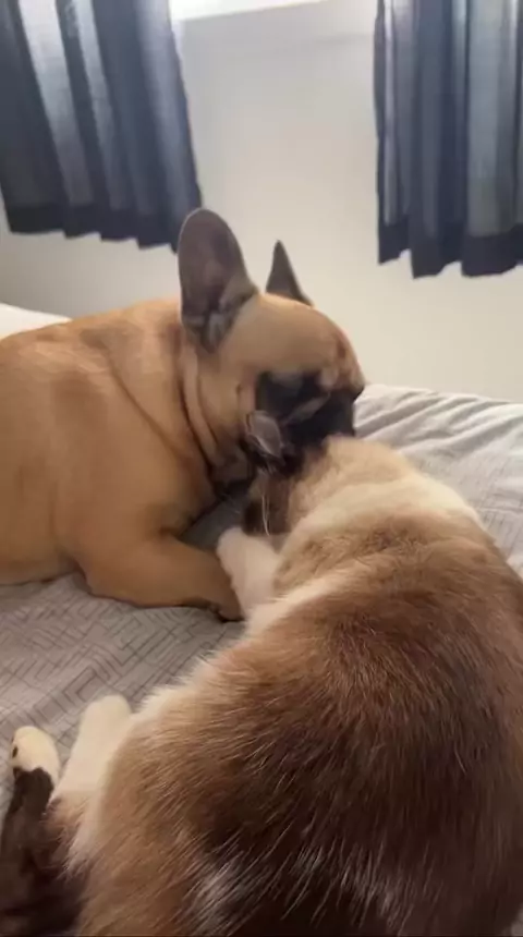 É muito amor pelo mano 🥰 Ozzy e Theodor ❤️ #veterinária #Bulldog #amomeupet #CrescerNaFamília