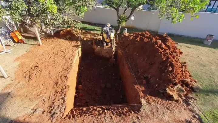 Mini retroescavadeira escavando buraco para piscina