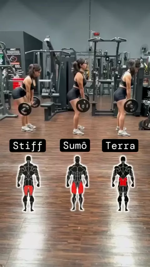 Stiff: É um exercício de levantamento onde você segura uma barra ou halteres na frente das coxas e se inclina para a frente, mantendo as costas retas. Ele enfatiza os músculos isquiotibiais (parte de trás da coxa) e glúteos. Sumo: Neste exercício, você realiza um levantamento de peso com as pernas afastadas além da largura dos ombros e os dedos dos pés apontando para fora, enquanto segura a barra. Ele coloca mais ênfase nos músculos internos das coxas e nos glúteos. #gym #fitness #fy #Academia