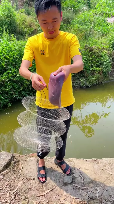 Coloque um pouco de fígado de porco na pequena rede para pegar lagostim facilmente. # rede pequena # pegar peixe e camarão # pegar lagostim