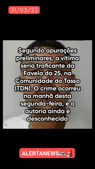 🚨 HOMICÍDIO REGISTRADO EM FORTALEZA 🚨 📅 Data: Segunda-feira (31) 📍 Local: Rua Melo César, Cidade dos Funcionários – Fortaleza 🏪 Referência: Próximo à Pague Menos 🔴 Vítima: Jair da Silva Santos, vulgo "Jajá" 💥 Crime: Execução a tiros 🕵️♂️ Informações: Segundo apurações preliminares, a vítima seria traficante da Favela da 25, na Comunidade do Tasso (TDN). O crime ocorreu na manhã desta segunda-feira, e a autoria ainda é desconhecida. #últimasnotícias #ultranotícia #flagrante #ceara3xma