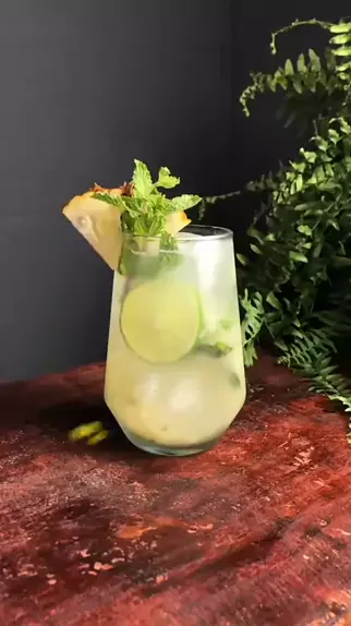 Mojito de abacaxi sem álcool 😋🍹 Para o drink: 250g de abacaxi, 10 folhas de hortelã, 2 colheres rasas de açúcar, 1 limão, bastante gelo, complete com água com gás. #mojito #drinks #bebida #frutas #Hortelã