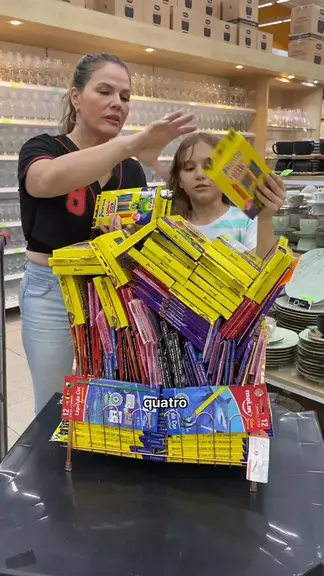 Foram empilhadas todas as caixas de lápis de cor que tinham no supermercado, será quantas caixas Alice conseguiu equilib? #CarnaKwaiComigo #equilibrio #lapisdecor #desafio