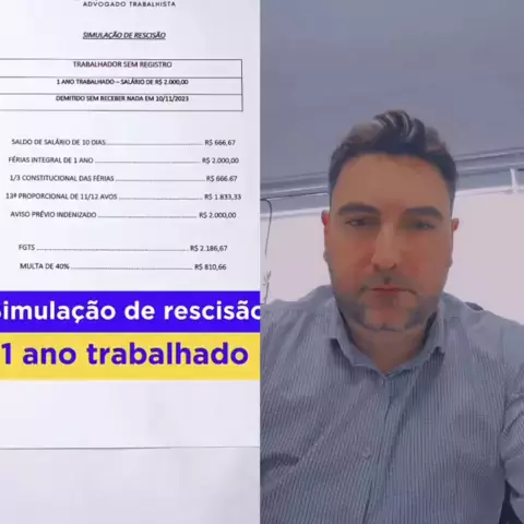 simulação de rescisão de contrato de trabalho para um trabalhador sem registro, com vários cálculos de valores devidos, como saldo de salário, férias, 13º salário e FGTS. O valor total a receber é R$ 12.330,66. Uma legenda apropriada para um vídeo sobre isso poderia ser: "Desvendando os direitos na rescisão: como calcular o que é devido ao trabalhador não registrado. #DireitoTrabalhista #Rescisão #EstudarComigo #aprendanokwai #kwaiEducaçãoBrasil