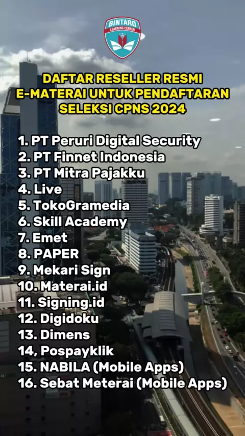 Halo sobat, silakan catat ya! Di atas itu adalah daftar reseller resmi yang bisa jadi alternatif pembelian E-materai kalian dalam melengkapi data pendaftaran seleksi CPNS 2024. Biar gak ketinggalan info penting dan terupdate seputar CASN 2024, yuk follow akun Bintaro Learning Center. Biar tak tanggung-tanggung sekalian aja gabung jadi member di BLC, wujudkan impian kalian bersama kami.ππ» #emateraicpns #kemenag #cpnskemenag2024 #soalfr #jadwalcpns #jadwalpppk #bintarolearningcenter #cpns #pppk...
