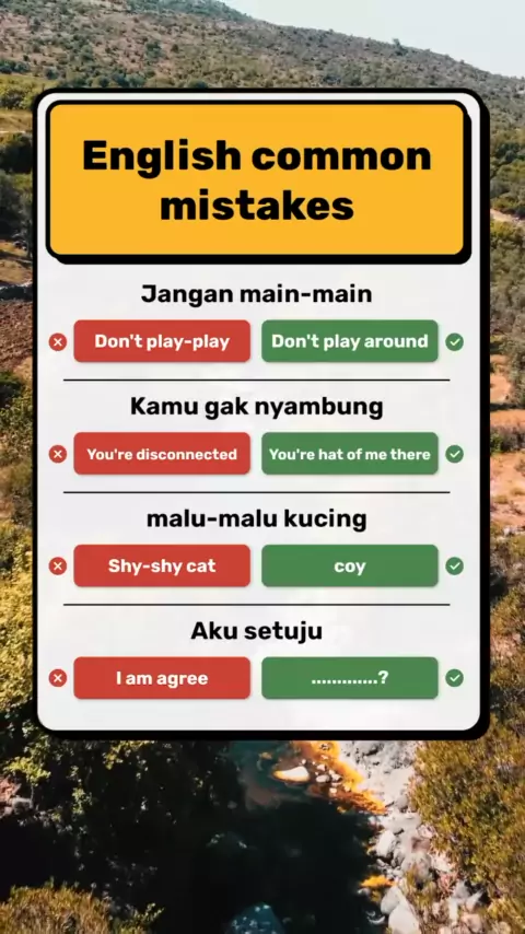 Ini dia kalimat bahasa inggris yang sering ngawur udah dibenerin! Jadi sekarang pakai kalimat yang sudah benar yah π No what - what namanya juga lagi belajar. Ada yang tau kalimat terakhir yang bener apa? π€#belajar#slang#englishslang#englishlesson#englishclass#vocabulary#belajarbahasainggris#bahasainggris#