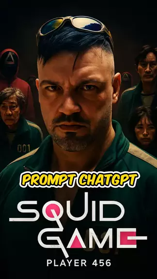 Criar This image is a promotional poster from the Netflix series Squid Game, showcasing the main character Seong Gi-hun (Player 456) at the center, surrounded by other key participants dressed in green tracksuits with white stripes, symbolizing their roles in a deadly survival game. The dark background and intense expressions emphasize the show's thriller and dystopian themes. Designed in a cinematic poster format, this composition uses a bold, minimalistic style with dramatic lighting to captur