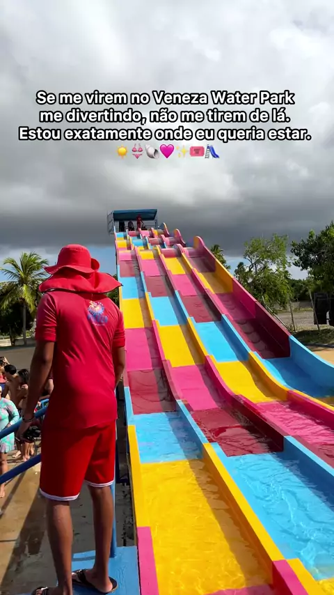 Estou no meu lugar perfeito! Cada segundo aqui é pura diversão. ☀️💦🌊🩷👙 | Vocês teriam coragem de ir nesse brinquedo?? #venezawaterpark #diversāo #reels #piscina #sol @venezawaterpark