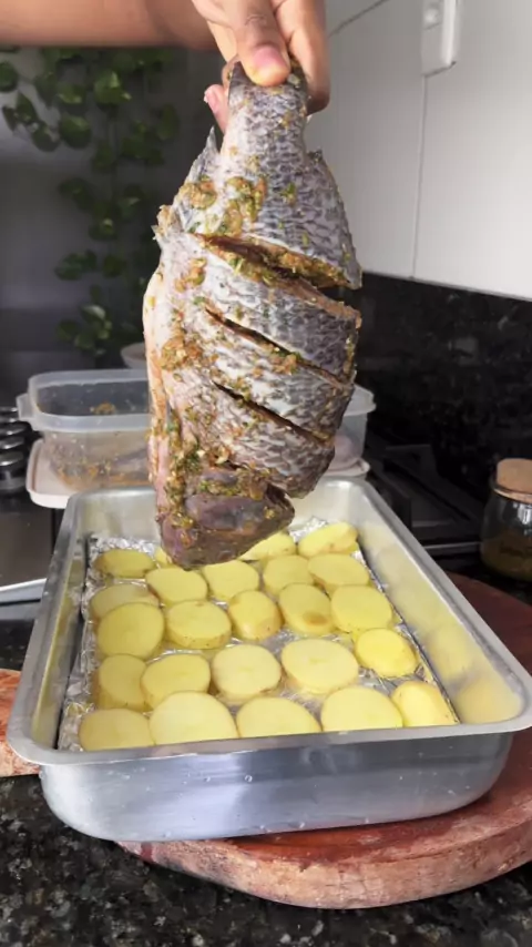 Almoço completo de hoje peixe assado no forno 🐟 #almoço #almocododia #comidacaseira #peixeassado #peixes Quem aí ama uma comida caseira e prática 😌👇🏽👇🏽