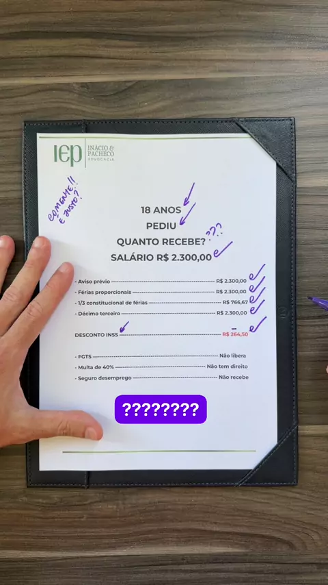 Veja quanto recebe esse trabalhador após 18 anos de trabalho e ter pedido demissão salário de R$2300 avisa pré férias proporcionais 1/3 condicional de férias 13º desconto do INSS FGTS multa de 40 por cento de seguros desemprego total a receber está no vídeo comenta que você achou #lei #clt #direito