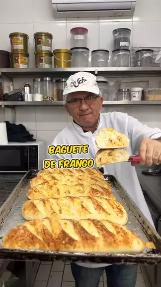 Baguete recheada com frango e mussarela Ingredientes: 1kg de farinha, 50g de açúcar, 15g de sal, 80g de margarina, 10g de melhorador, 30g de fermento fresco, 550ml de água, 300g de frango, 100g de mussarela e 100g de parmesão #baguete #pão #Receita