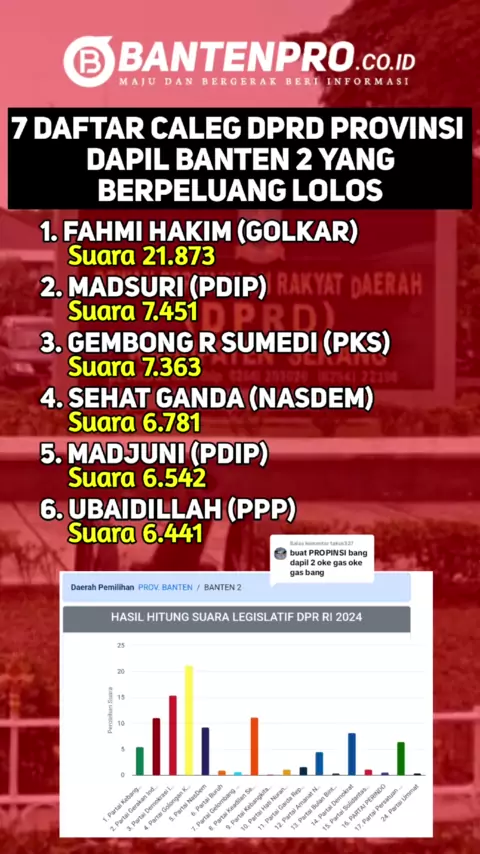 Membalas @takus327 Berikut itulah beberapa daftar Caleg DPRD provinsi Banten, dapil Banten 2 yang berpeluang lolos . . Hasil perhitungan suara tersebut masih bersifat sementara, dan akan terus diperbarui kembali oleh KPU. Mengingat, perhitungan suara masih berlangsung hingga saat ini.#infoserang#dprdbanten#banten#pileg2024#pemilu2024#provinsibanten