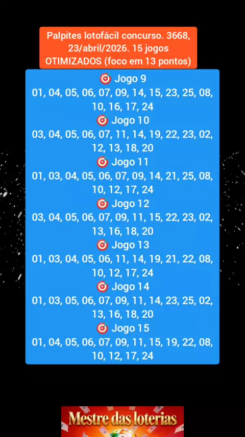 Palpites da lotofácil concurso. 3668, 23/abril/2026. 15 jogos OTIMIZADOS (foco em 13 pontos) Siga, compartilhe e comente eu quero para receber mais palpites de jogos. Confira o resultado da lotofácil de hoje. Chama no chat para fechamento. #palpites #jogos #lotofácil #sorte #abençoado