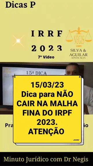 Dicas para NÃO CAIR NA MALHA FINA DA RECEITA FEDERAL - IRRF 2023. Vídeo 7/10 #SejaCriador #KwaiFamilia #Ultra10Kvis #irrf2023 #ComentaristaDeNotícias Quer saber mais? Inscreva-se nos nossos Canais e Fique por dentro das principais notícias jurídicas. Linktree https://linktr.ee/negisadvocacia www.negis.com.br