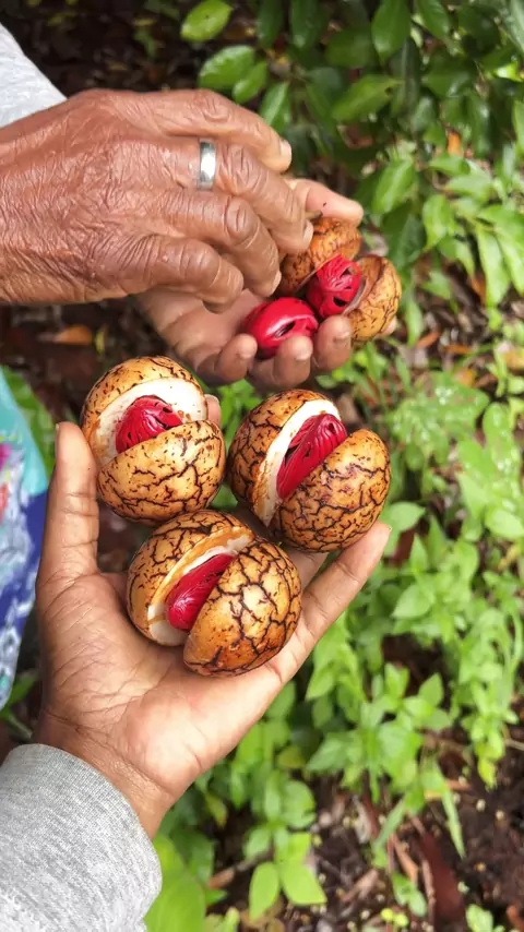 Fazendo colheita de noz-moscada com vovó
