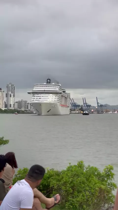 navegando no rio itajaí-açu um grande transatlântico lá no fundo a cidade de Itajaí Santa Catarina Litoral Norte