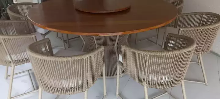 mesa com tampo de madeira 🪵🪵 e estrutura em alumínio e cordão naval sintético almofadas aquablock impermeável resistente a sol ⛅⛅☀️ e chuva 🌧️🌧️☂️🌧️ #designdeinteriores #viraliza #moveisplanejados #moveisareagourmet #moveiscommadeira