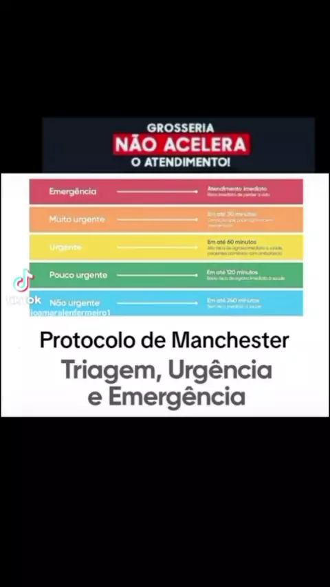 Protocolo de Manchester no Brasil 🇧🇷🇧🇷🇧🇷🇧🇷🇧🇷🇧🇷🇧🇷🇧🇷🇧🇷🇧🇷🇧🇷 Nível 1, vermelho: socorro imediato. Nível 2, laranja: 10 minutos. Nível 3, amarelo: 60 minutos. Nível 4, verde: 120 minutos. Nível 5, azul: 240 minutos.
