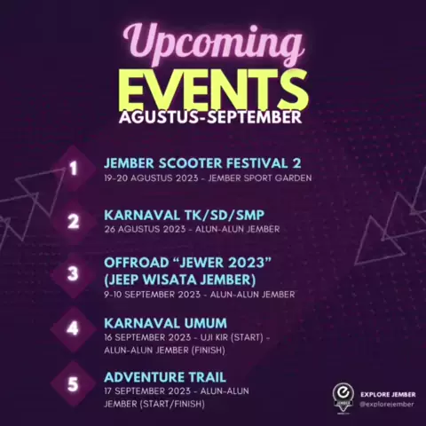 CATAT TANGGALNYA!! . Inilah jadwal event yang akan digelar Agustus-September 2023. Jangan lupa ya rek.. tetap jaga kebersihan dengan membuang sampah pada tempatnya atau bawa pulang sampahmu π Jika informasi ini bermanfaat, jangan lupa untuk save dan share ya.. #explorejember #jember # #jatim #explorejawatimuran #jemberkueren #beritajember #exploreindonesia