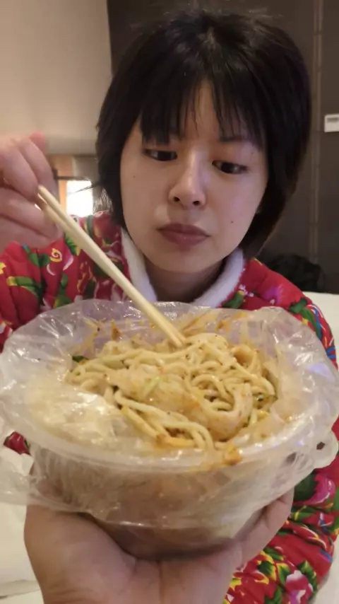 Namorada japonesa come macarrão frio pela primeira vez