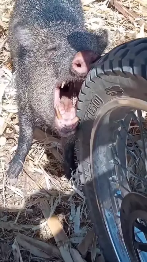 porco catitu ataca motoqueiro e fura o pneu de sua moto