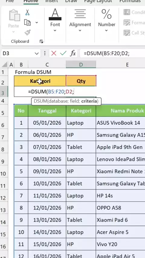 rumus DSUM Excel #excel #exceltricks #exceltips