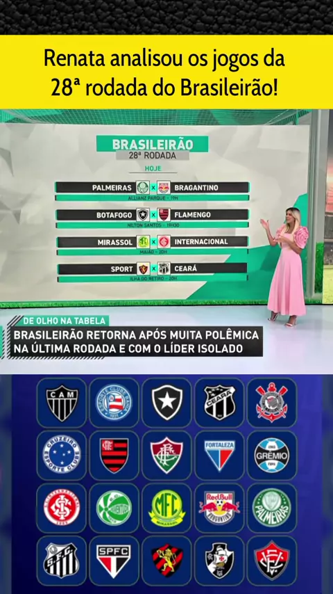 Renata analisou os jogos da 28ª rodada do Brasileirão l: Palmeiras x Bragantino, Botafogo x Flamengo, Santos x Corinthians, Atlético MG x Cruzeiro, Gremio x sao Paulo! #Palmeirasxbragantino #BotafogoXFlamengo #santosxcorinthians #brasileirão2025 #esporteviral