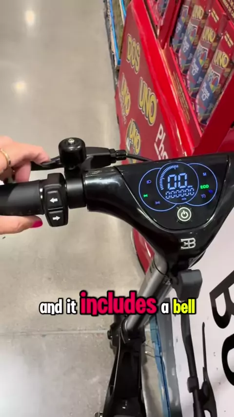 Esta scooter elétrica Bugatti que vai até 22 mph, tem uma autonomia de bateria de 30-37 milhas, pneus de auto-reparo, pisca-piscas, um logotipo de luz na parte de trás e display led e um código de bloqueio. # Costco # Bugatti # electricscooter