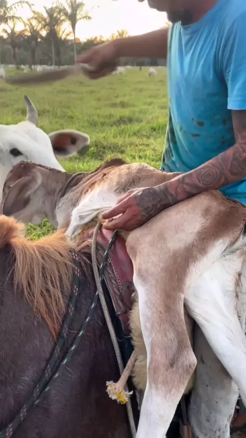 Tião fazendo o corte do umbigo de um bezerro recém nascido