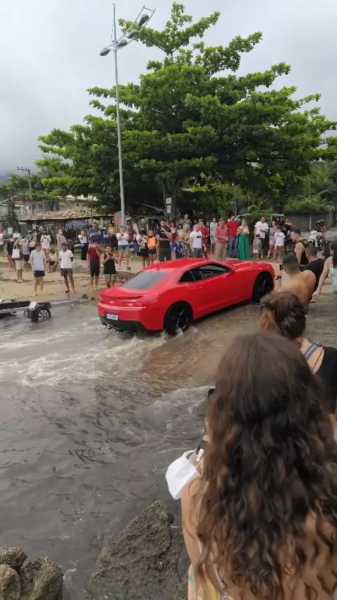 Camaro atola em praia de Ilhabela