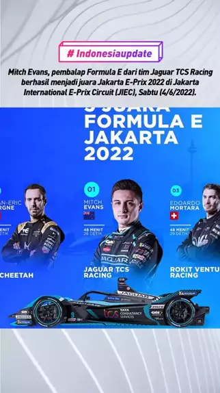 Mitch Evans, pembalap Formula E dari tim Jaguar TCS Racing berhasil menjadi juara Jakarta E-Prix 2022 di Jakarta International E-Prix Circuit (JIEC), Sabtu (4/6/2022). Disusul oleh Joan Eric Vergne dan Edoardo Mortara yang berada di podium 2 dan 3.Selamat