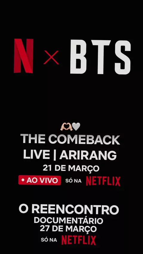ARMYS. ATENCÃO! 21 de marco - 8h da manhã (horário de Brasília) - BTS THE COMEBACK LIVE I ARIRANG - um show ac vivo exclusivamente na Netflix. 27 de marco - BTS: O Reencontro - um documentário que mostra os bastidores da criação do álbum de comeback ARIRANG. #kpopBrasil #BTS #OT7 #ARMY #Btslove