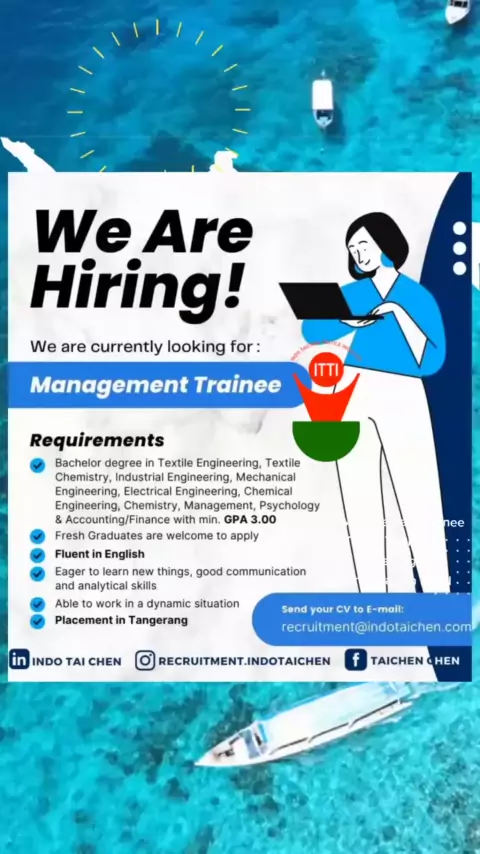 PT. Indo Taichen Tangerang#lokertangerang#tangerang#ptindotaichen#lokerbanten#banten#loker#lowongankerja#lowongankerja2023#lokerfreshgraduate Management Trainee Email lamaran ke: recruitment@indotaichen.com (Subject: Posisi yg dilamar) Alamat PT. Indo Taichen Jl. Gatot Subroto Km.3 (Jl. Kalisabi) Desa Uwung Jaya, Cibodas Tangerang 15138 Kota Tangerang - Banten - Indonesia