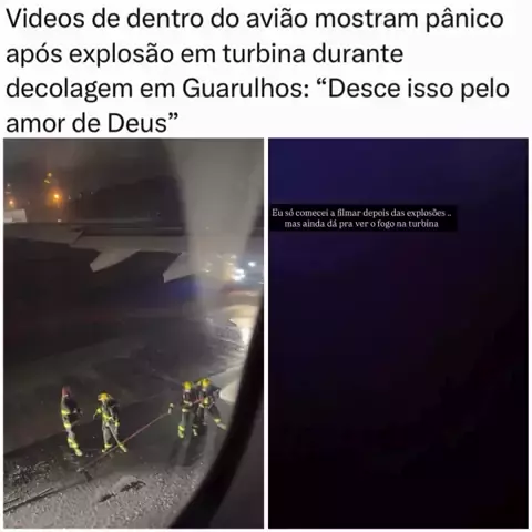 Vídeos gravados por passageiros mostram momentos de apreensão dentro de uma aeronave após uma falha em uma das turbinas durante a decolagem no Aeroporto Internacional de São Paulo/Guarulhos, na noite de domingo (29). As imagens foram registradas pela passageira Aline Araújo e mostram o momento em que o motor apresenta fogo logo após a saída do solo. Segundo o relato, houve um forte ruído no momento da falha. Nos vídeos, é possível ouvir o comandante informando sobre o problema e orientando os