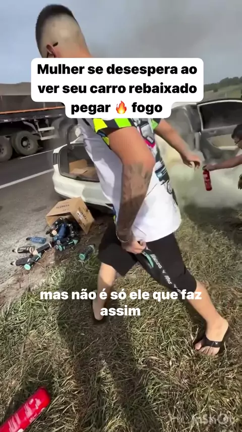 Mulher se desespera ao ver seu carro rebaixado pegando fogo