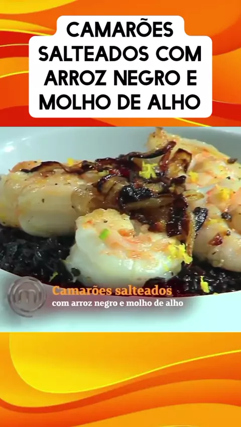 Camarões saltrados com arroz negro e molho de alho