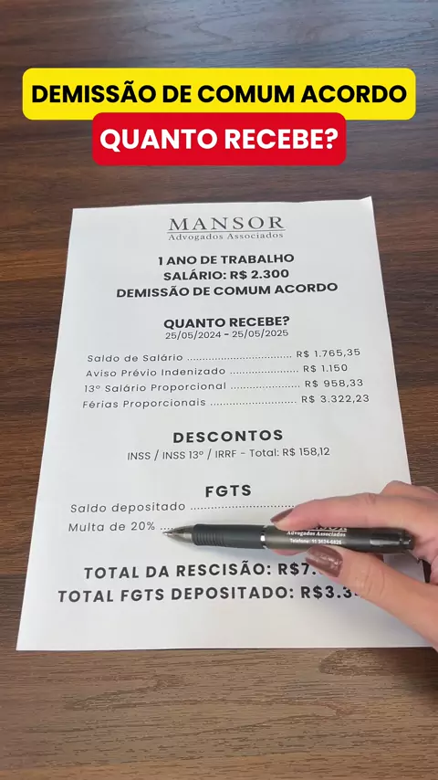 Demissão de comum acordo com salário de R$ 2.300. Quanto recebe? Veja uma estimativa do que pode receber na rescisão: ✅ Saldo de salário ✅ 13º salário proporcional ✅ Aviso Prévio Indenizado ✅ Férias proporcionais ⚠ Atenção: essa é apenas uma estimativa! O valor pode variar conforme o caso. #CálculoRescisão #CLT #DireitoTrabalhista #Demissão #FGTS