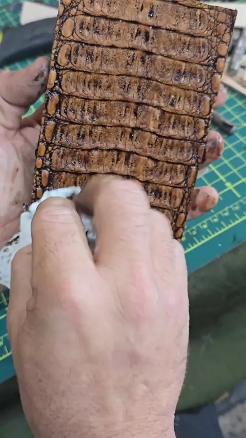 Aplicando gel form em couro de jacaré Dresch Couros #handmade #profissional #cutelaria