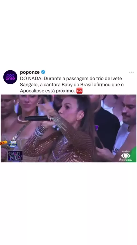 Baby do Brasil no Carnaval de Salvador: “Todos atentos porque entramos em Apocalipse, o arrebatamento tem tudo pra acontecer entre 5 a 10 anos” E pediu pra Ivete cantar Eva e ela disse que ia cantar Macetando porque ia Macetar o Apocalipse e que não vai deixar acontecer! #CarnavalDivida12K #VARdoCalabreso #ivetesangalo #fofocas #carnaval