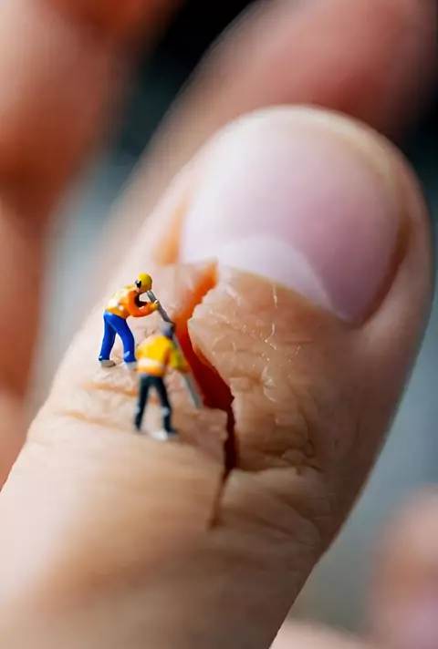 Tiny workers ⛏️ mining a fingertip crack! ✨ Surreal mini art sparks wonder. 🌟 What's your tiny adventure? Share below! 👇 . #MiniatureArt #SurrealPhotography #CreativeMiniatures #TinyWorld #ArtisticIllusions . Follow for more & collab ideas! 🚀