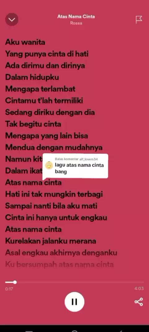 Membalas @alf_lovers34 Done ya kak, thanks for the request... Soo let's sing together with Rossa - Atas Nama Cinta.....#rossa#atasnamacinta#nyanyibareng#spotipy2023#dongggggggg#liriklagu#liriklaguviral#bismillah#samlanfamily#adharizqaridha#trendliriklagu#StoryLirikLagu#MusikStory#bestsongever#beautifullyrics#RecommendedSongs#LaguDenganLirik#MyFavouriteLyrics#requestlagu#LirikLaguPOP#songlyrics