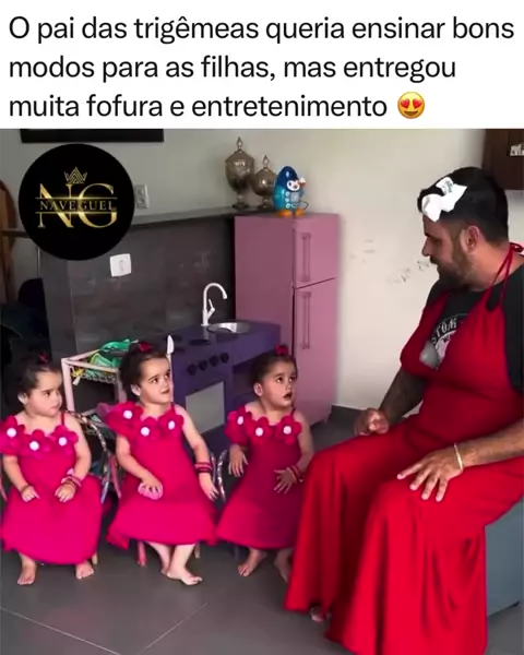 🥹💖 Quando o pai das trigêmeas resolveu ensinar “bons modos”, ninguém esperava uma aula tão cheia de charme! O trio entregou risadas, fofura e aquele caos organizado que só crianças sabem fazer 😂🎀 É impossível não se apaixonar por essa cena — e por esse pai que entrou totalmente no personagem! 🤣🙌 #fofura #trigêmeas #família #momentosqueimportam #amor