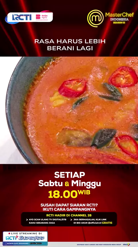 Dari segi rasa enak tapi kurang berani sama bumbu saja. RCTI Hadir di CHANNEL 28, ikuti cara mudahnya: * Aktifkan LCN lalu scan ulang STB Kamu * Scan otomatis TV Digital Apabila masih bermasalah dengan siaran @officialrcti ditempat kamu? Silahkan cek link berikut ya ⬇️⬇️⬇️ https://bit.ly/LayananSolusiDigital MasterChef Indonesia Season 13 #M#MasterChefIndonesiaSeason13M#MasterChefIndonesiaM#MCIS13MCIS13diRCTI