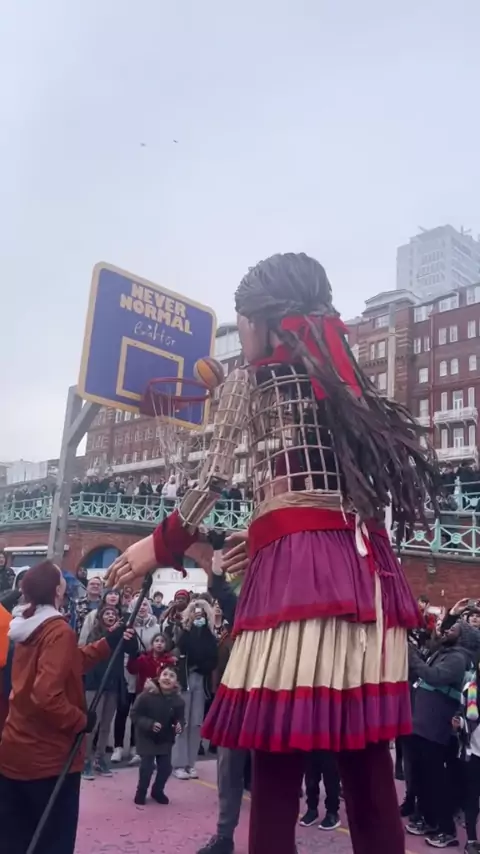 Ela é bonita, mas o basquete não é para a pequena Amal, apesar de sua altura. Qual esporte seria mais apropriado para ela? # giant # giantpuppet # littleamal # Brighton # basketball