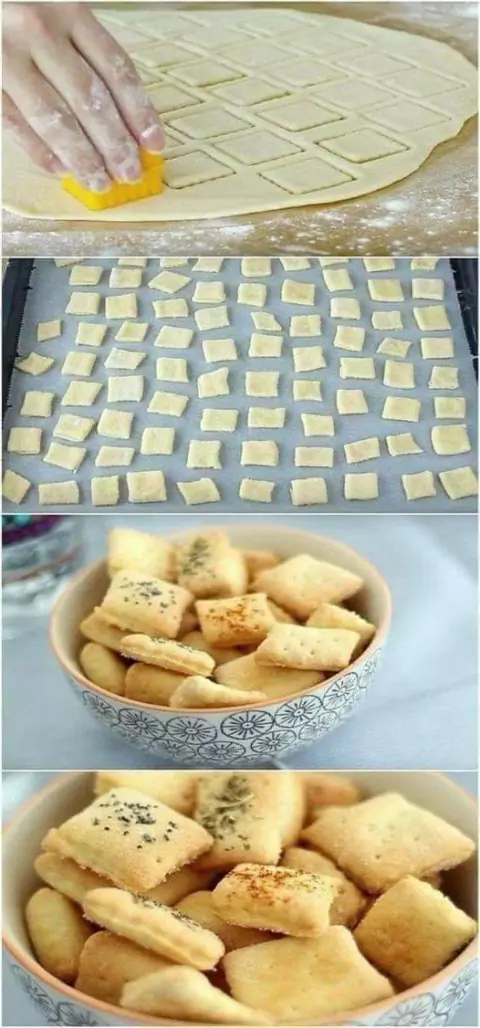 Fazendo BISCOITINHOS APERITIVOS 200 gramas de farinha de trigo 1 ovo 1 colher chá de sal 1 colher chá de fermento 45 ml de água 45 ml de óleo Sal Temperos a gosto Em uma tigela, coloque todos os ingredientes e misture bem até formar uma massa homogênea. Deixe na geladeira por 30 minutos. Em uma superfície enfarinhada, abra a massa com o rolo. Coloque os biscoitos numa assadeira e faça os furinhos Polvilhe os biscoitos e leva pra assar por 15 minutos #ComidaDiária #CrescerNaFamília