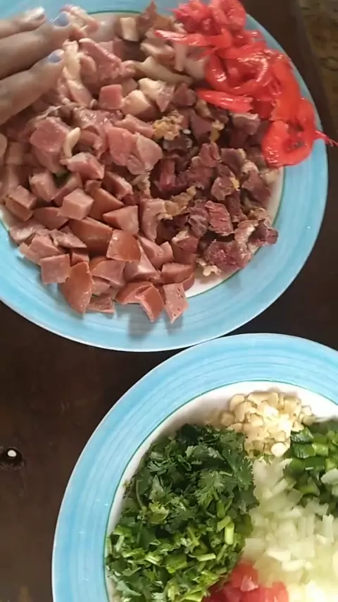 Quiabada Baiana! 1 cebola média 1 tomate pequeno coentro,cebolinha e 3 dente alho 500gm de carne de sertão 1calabresa 300gm de Bacon 500gm de carne de Boi 30 quiabo sal a gosto e colorau 40gm de camarão seco
