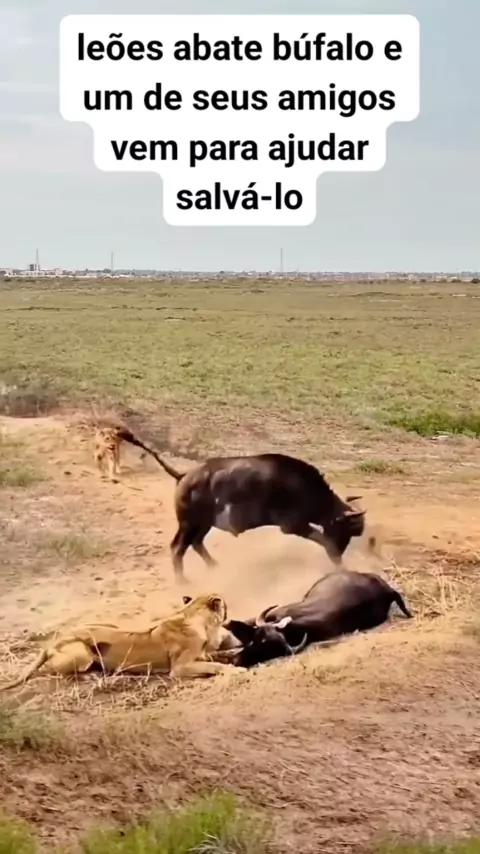 leões recuam quando amigo de búfalo vem para ajudá-lo