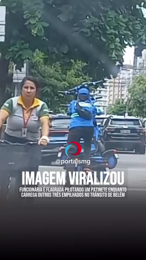 ⚠️ VIRALIZOU Nesta quinta-feira (02), em Belém, uma funcionária da empresa de patinetes de mobilidade urbana foi flagrada pilotando um, enquanto transportava três patinetes empilhados sobre ele, se equilibrando em meio ao trânsito da cidade. 📲SIGA @portalsmg para mais informações! #PortalSmg #Viral #Trending #Fyp #noticias