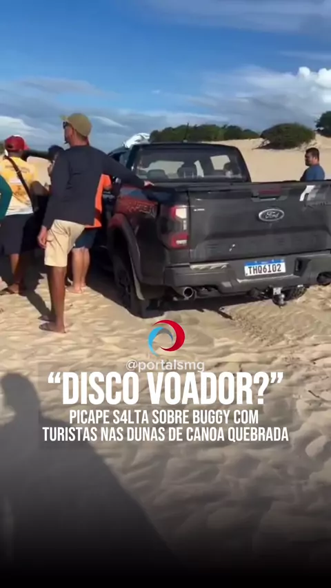 ⚠️ VIRALIZOU Um vídeo inusitado tomou conta das redes no último sábado (17): uma picape literalmente “voou” por cima de uma duna na praia de Canoa Quebrada, em Aracati, no Ceará. A cena impressionante mostra o momento em que o veículo s4lta por c!ma de um buggy, que estava com turistas dentro. O final não foi de cinema: os quatro pneus estouraram, o airbag foi acionado, e o motorista da picape identificado como um empresário da cidade de Russas, precisou ser levado ao hospital para atendimento