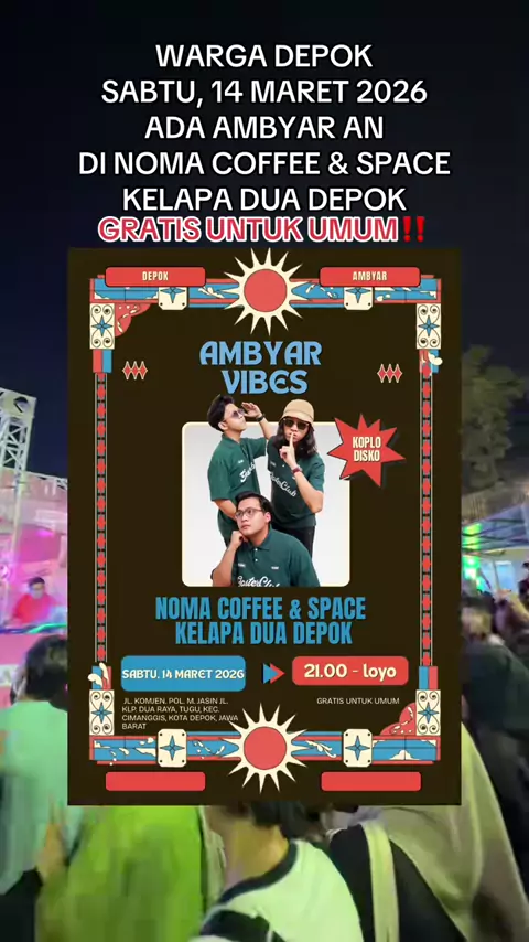 WARGA DEPOK SABTU, 14 MARET 2026 KITA AMBYAR AN YUK DI @nomacoffeespace KELAPA DUA DEPOK, GRATIS UNTUK UMUM‼️ ⏰ : 21.00 - LOYO 📍 : NOMA COFFEE & SPACE ( Jl. Komjen. Pol. M. Jasin Jl. Klp. Dua Raya, Tugu, Kec. Cimanggis, Kota Depok, Jawa Barat )#konsergratis#infokonser##ambyar#depok